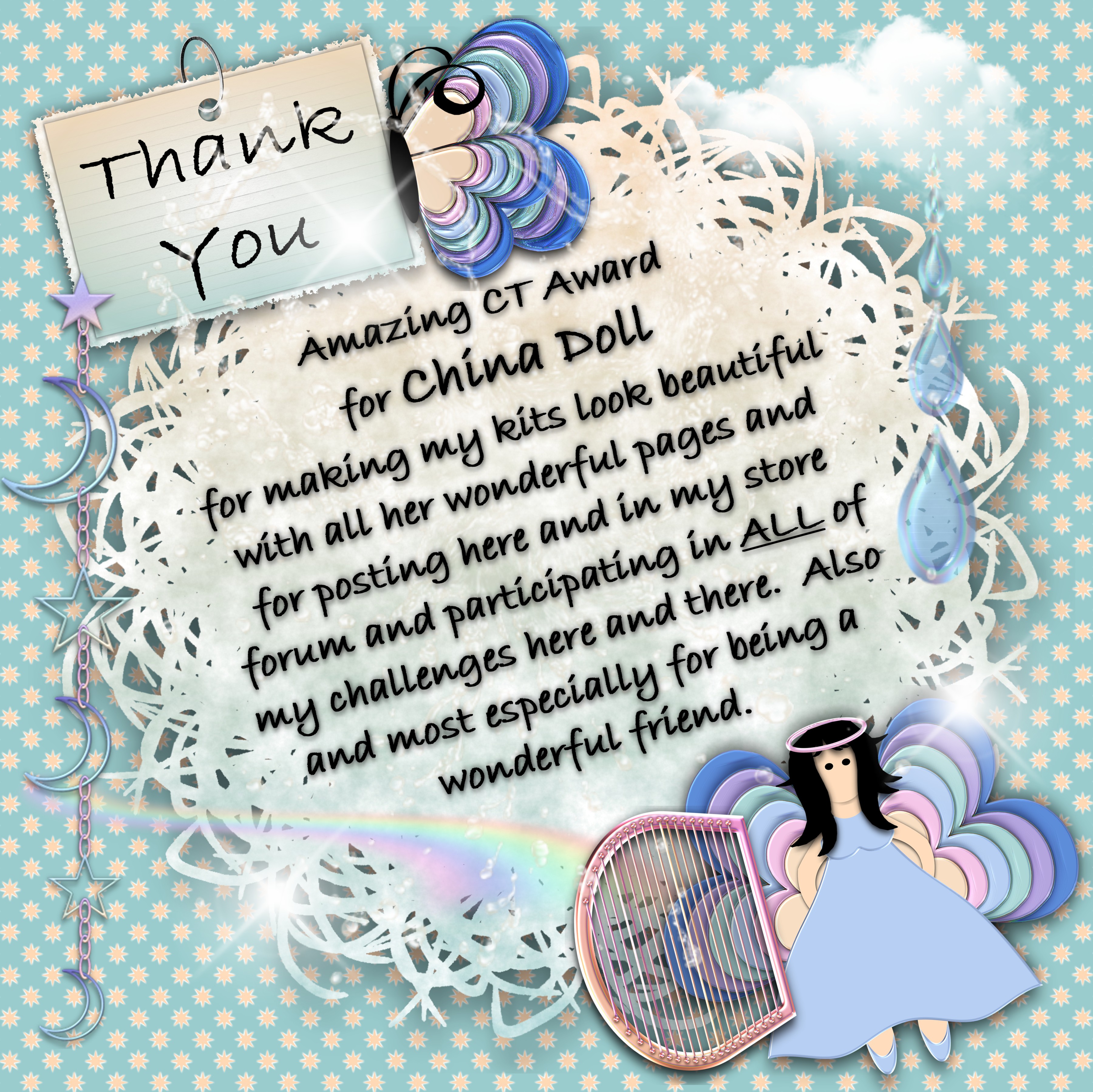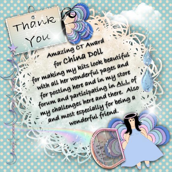 To my CT Vivian aka China Doll. Thank you for all you do for me. I love that you post here and in my store forum. I want you to know my store thinks that you are awesome for posting layouts. You really ROCK. And thanks for being my friend. THANK YOU.