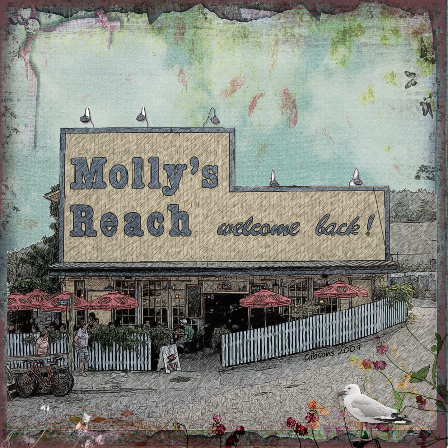 Cloud paper from Chaos Lounge Spring Treasures blended with couple of papers from Chic Spring; flowers I edited from Chic Spring; Seagull I edited from AWP Beach Hut; two grunge overlays from Vera Lim (color changed on one) and photo edited in Akvis Sketch