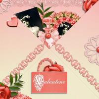 I used Valentine Surprise and Recollection for this layout... Cut a material square into 4 triangles. Then layered the sections and added shadow. Arranged elements to decorate, colouring some and adding shadow for depth.
