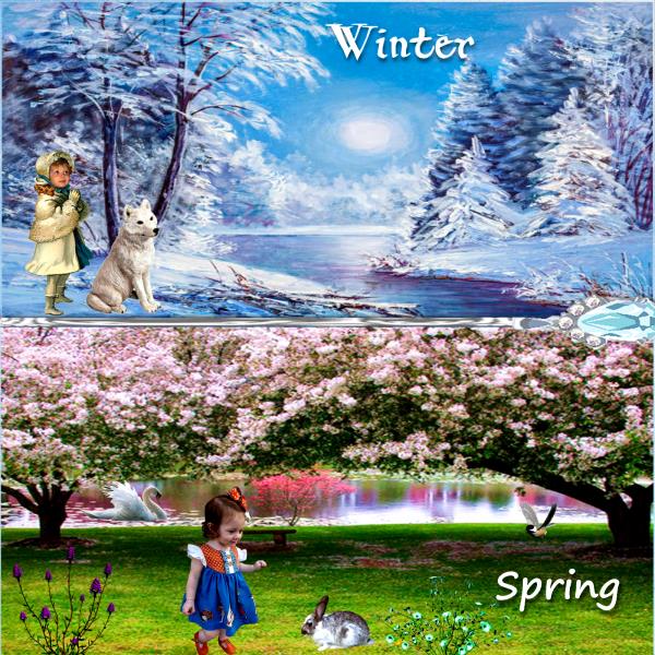 LC Heaven Above BG.2, Winter and Spring photos from the net, Bunny by Whop .RDH Winter Dream World dog 3, RDH Change of Seasons flowers5 and 9 and bird