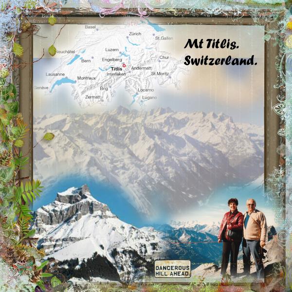 Map and mountains from the net. My photo of Barry and me very near the top of Titlis with many of the other mountains spread out behind us. Elements by Karen Schulz from her kit Nature Hike 2 PSE2023