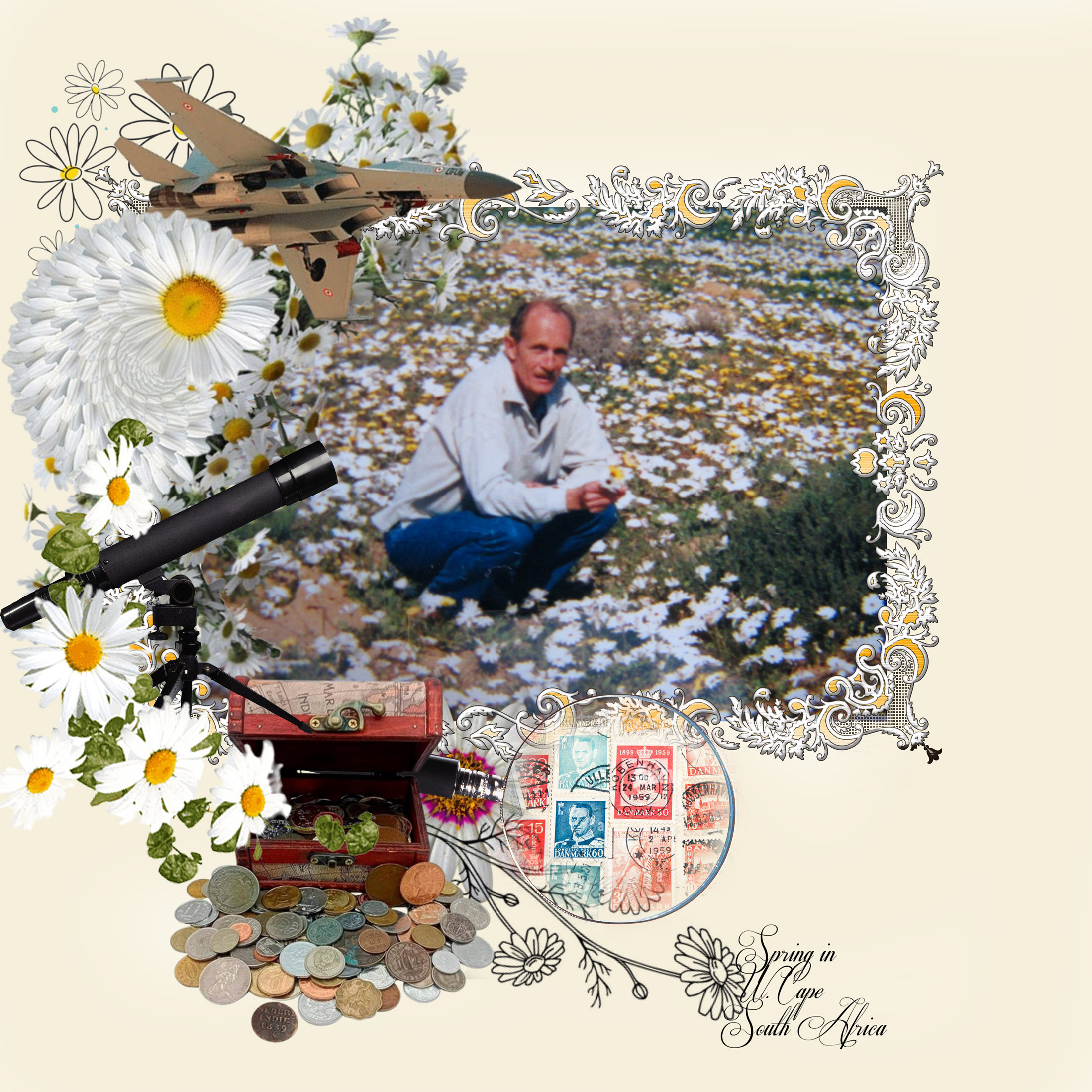 For yje photo and cluster 25 challenge My hubby, wild flower spring in Cape, South Africa I tried to include his interests in the cluster. RDAF, Astronomy, stamp and coin collection