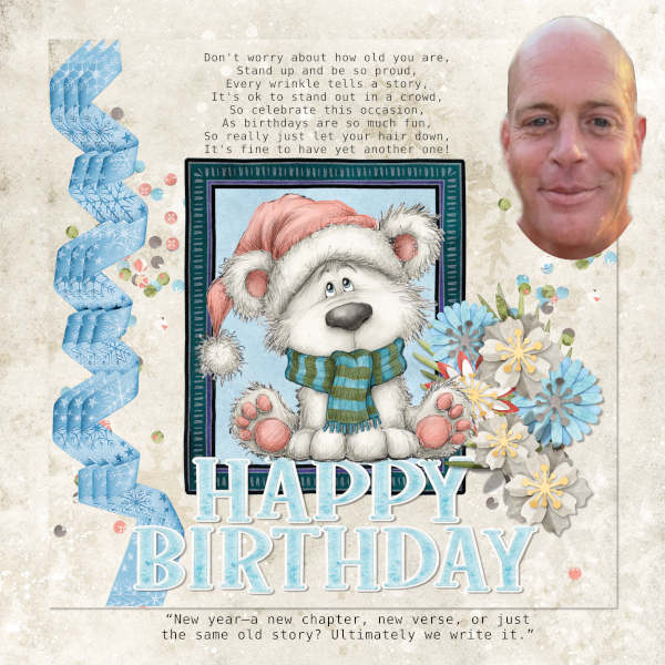 Credits: Polar Opposites Bundle by Kristmess Designs https://tinyurl.com/PolarOppositesKM Gingerscraps - January 2026 Quote Challenge - “New year—a new chapter, new verse, or just the same old story? Ultimately we write it.” Photo: Mine Font: Monospace