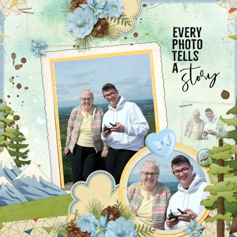For Joce's challenge. Changed yellow flowers to blue, added yellow frame round photo, blue heart and faded photo on right of page.