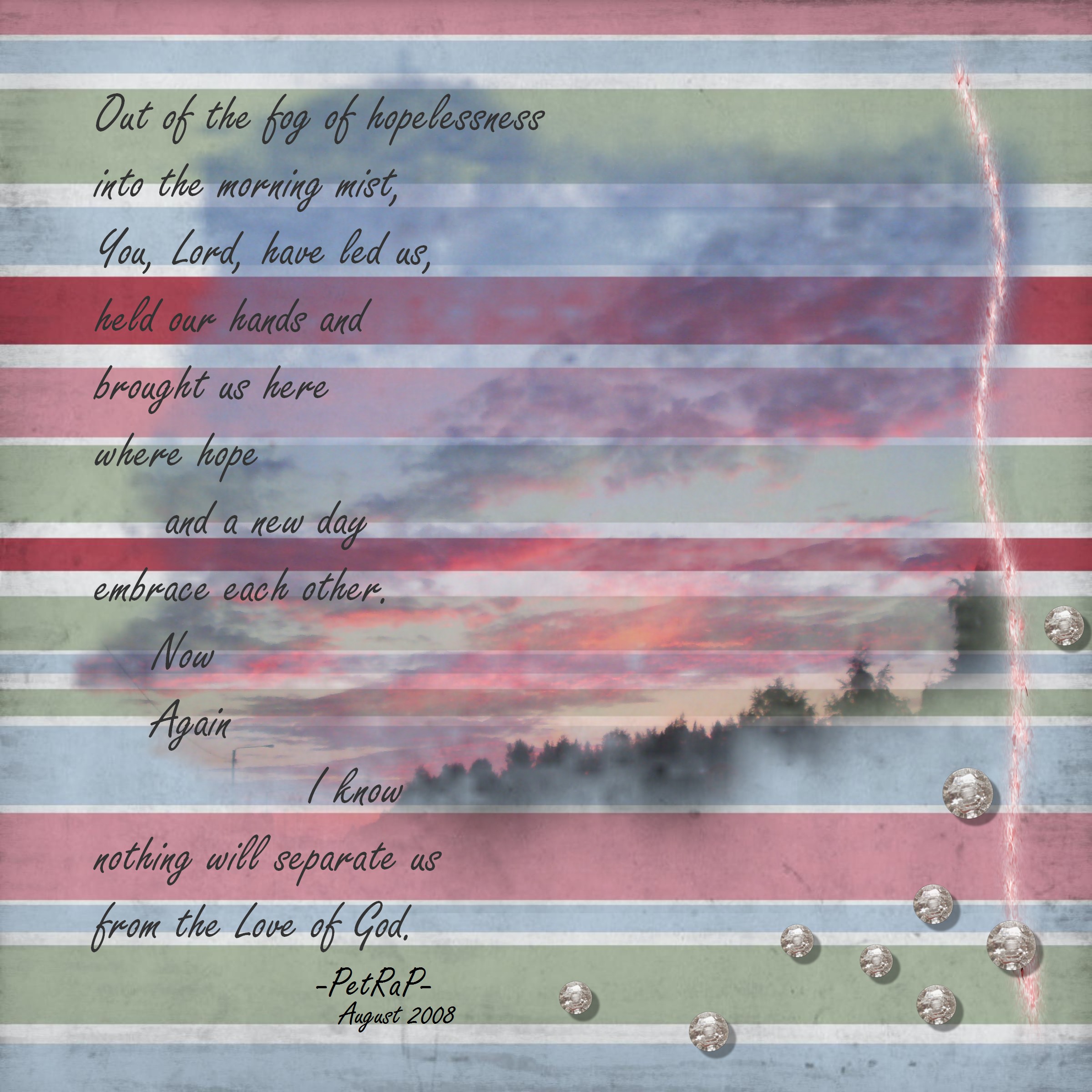 BG is called suger_stripes ... but I have lost the name of the maker in my files. :/ Ribbon and the diamonds are also stored without the name of the maker. Sorry. Photo and the poem are mine.
