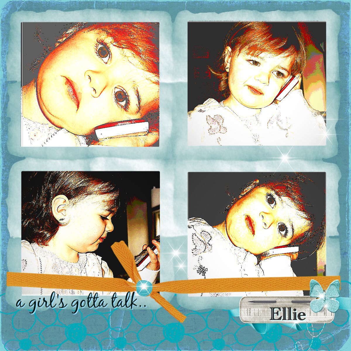 I kept taking stuff off this layout till it was almost down to nothing. I liked it simple better. Ellie is talking on the phone to her Aunt Hannah. She likes to chatter but most of the time only her mother can understand her. The pictures not included in this framed set are the pouty ones that followed when the phone was taken away from her. The joy of being 2....