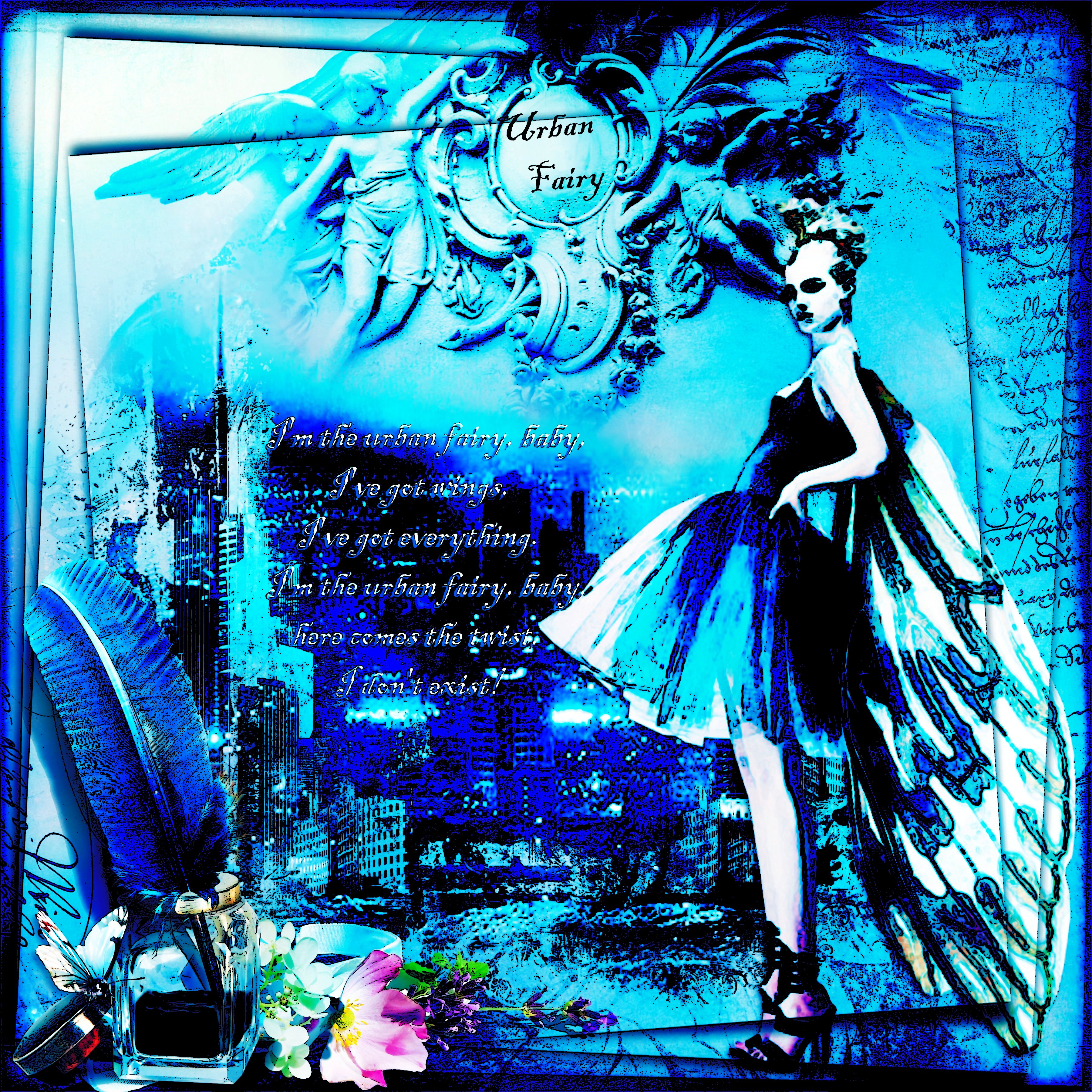 For fun.The fairy is a pic of a model in a black frothy frock with wings, much edited with Find All Edges & Comic Book FX.I've altered some of the lyrics to the song I'm the Urban Spaceman written by Neil Innes of the Bonzo Dog Doo-Dah Band for use with my Urban Fairy to suit the image.Thanks for looking in, your lovely comments are a pleasure to read, thank you x