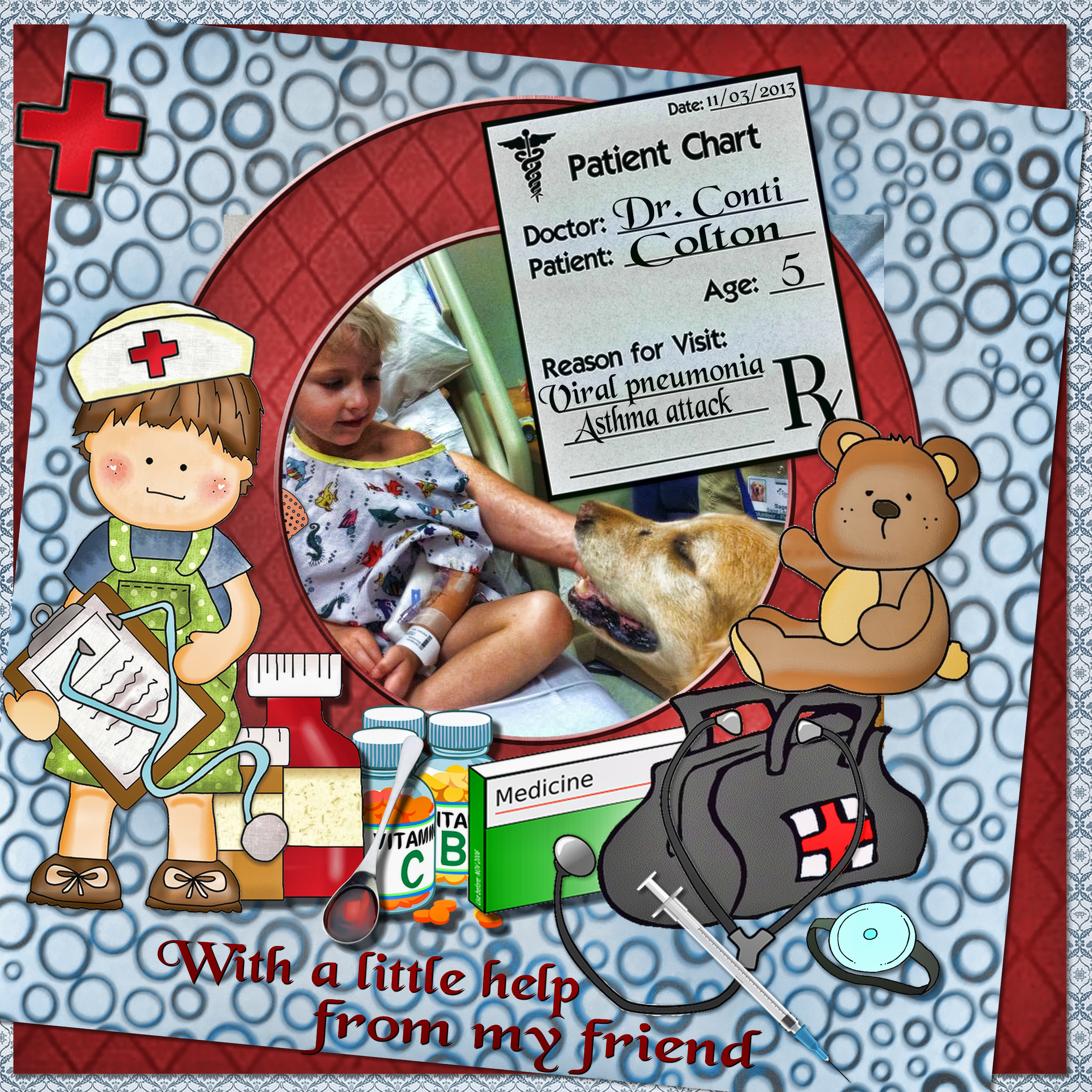 When I still had my beautiful Golden Retriever (Brandy) I took her to a local rehab hospital as she was a calming dog and she absolutely loved people. Xgern66 (Joce) suggested I put a page I made in the "My Favorite Page Scrapped by a Friend" challenge so I did exactly that. This is an adorable page of Colton recovering in the hospital and getting visited by what looks to be a Golden. 10++++
