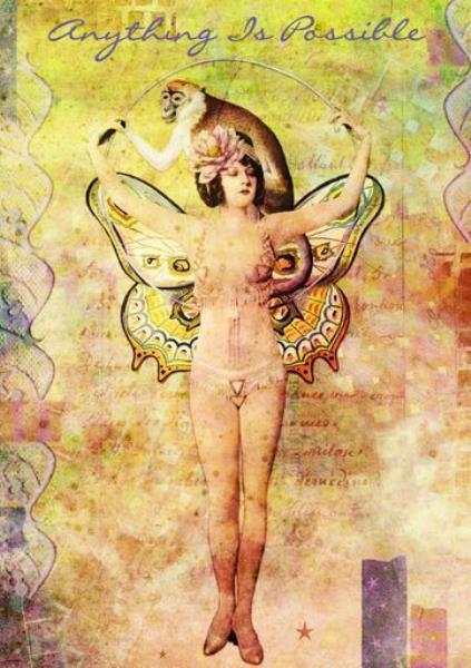 Fabulous and artsy page Heather, love the beautiful butterfly wings you've given her and the monkey perched on her shoulders. Beautiful artsy BG and borders with such a true quote. A delicious piece of elegant whimsy!