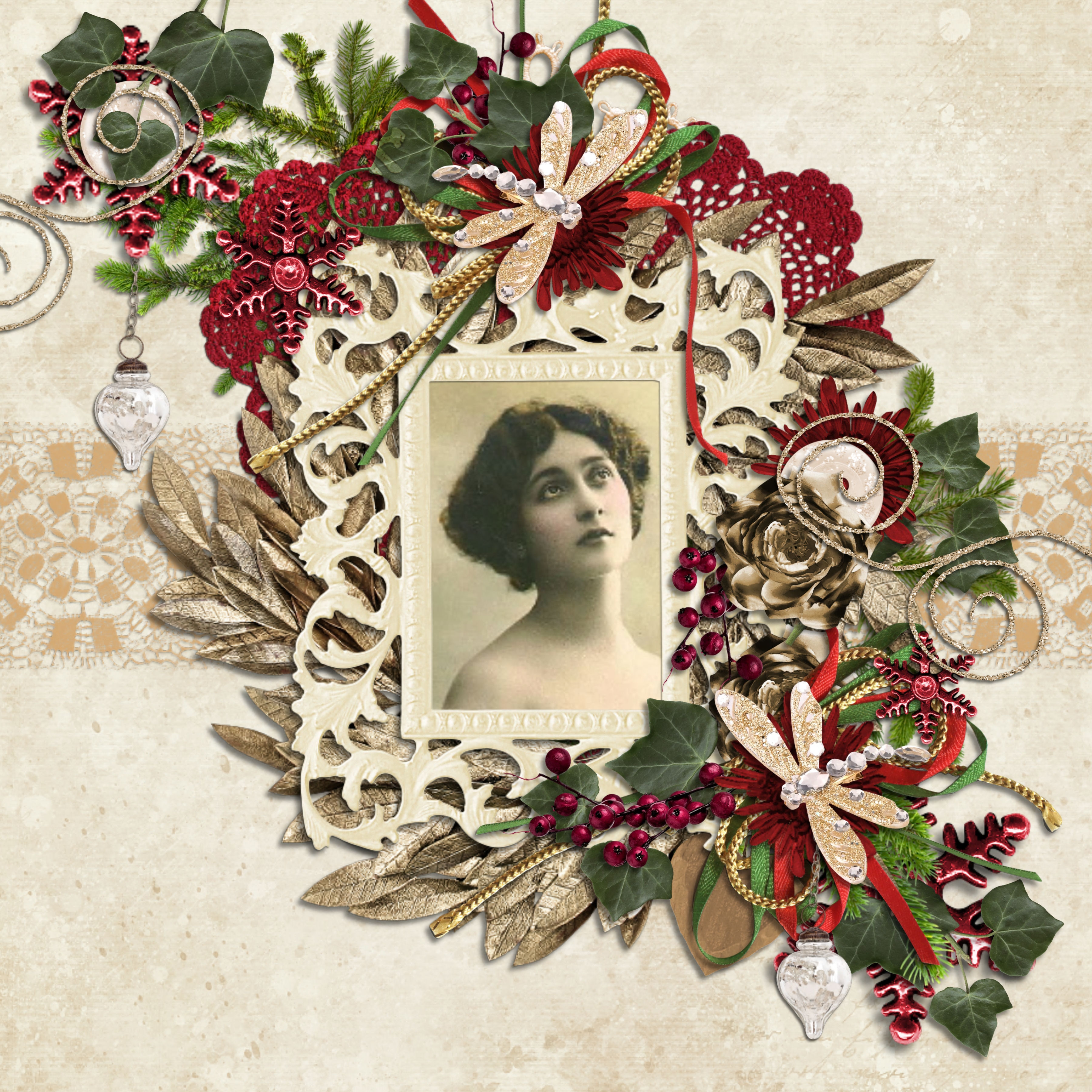 Such a big beautiful Christmas Carol cluster surrounding a vintage photo making for a very elegant page!