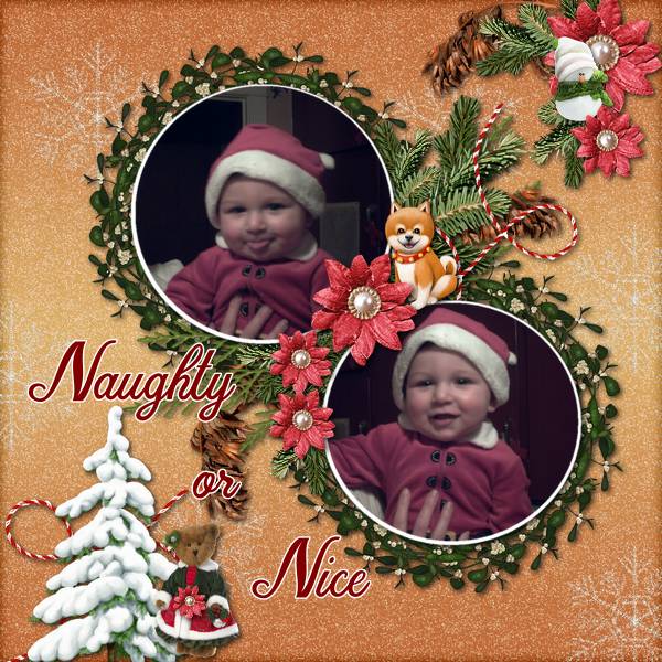 Sweet, cute and adorable layout of this little one with the tongue sticking out in one photo and getting happier in the other photo... naughty or nice. Lovely Christmas time page with great word art aand a cute cluster of elements!