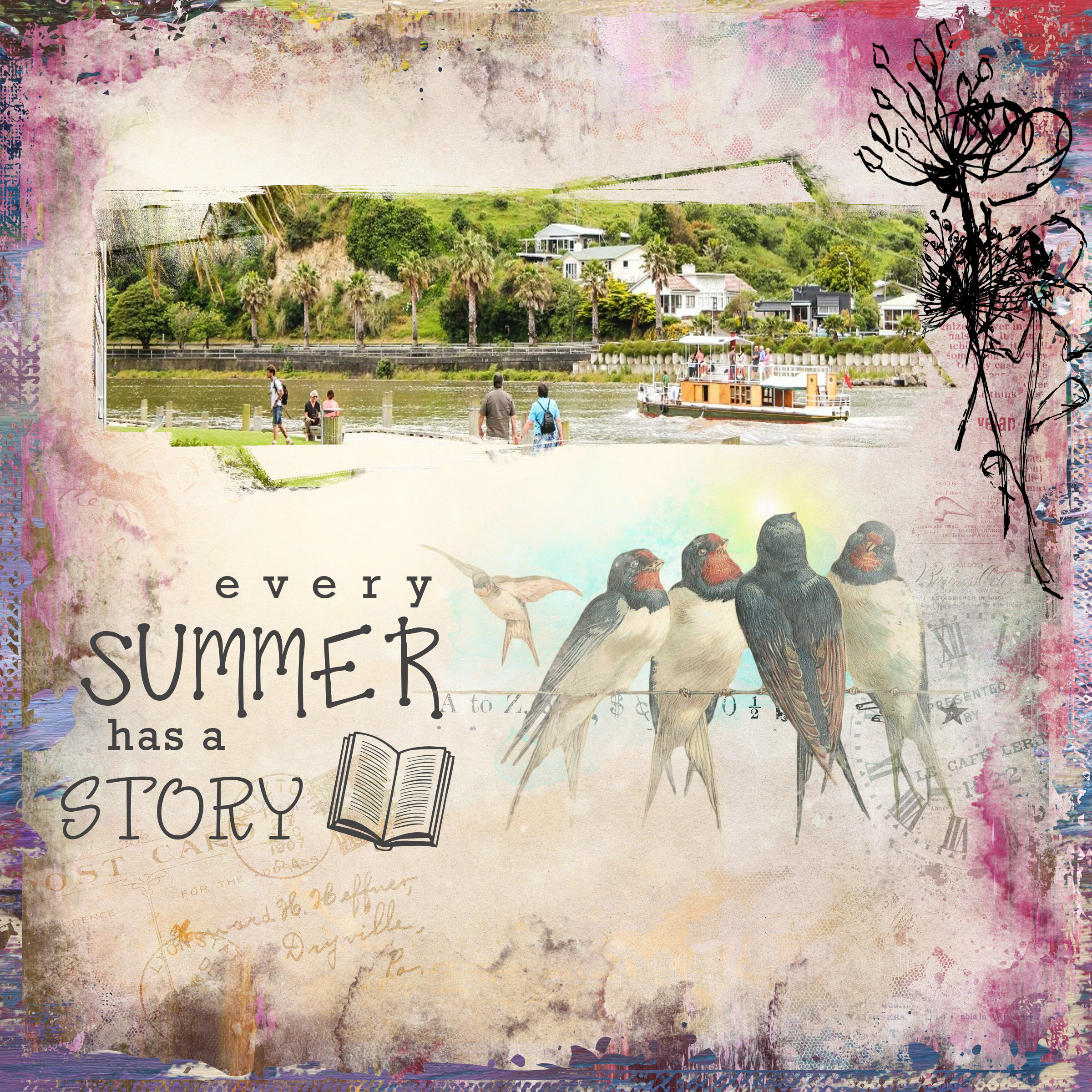 Certainly is a pretty town with the river running through it. A gorgeous page Joce Love the mask and the birds on the wire. Off to check out your challenge
