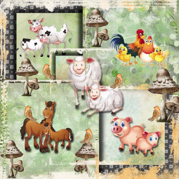 Farmyard animals found together on the net. Papers and edges by Karen Schulz Toadstools and birds from new kit by Art Addicts Designs. PSE2023