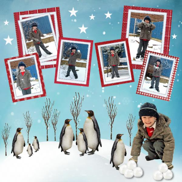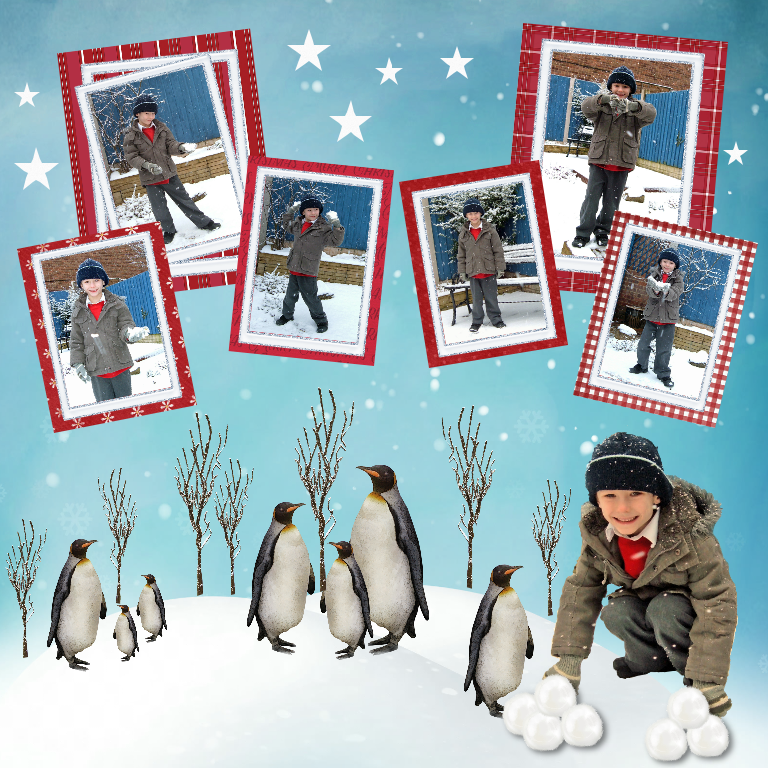 For Joce's Numerical challenge. Photos of Charlie taken years ago. 7 photos, 7 frames, 7 papers (6 used around photos) 7 stars, 7 penguins, 7 trees and 7 snowballs.