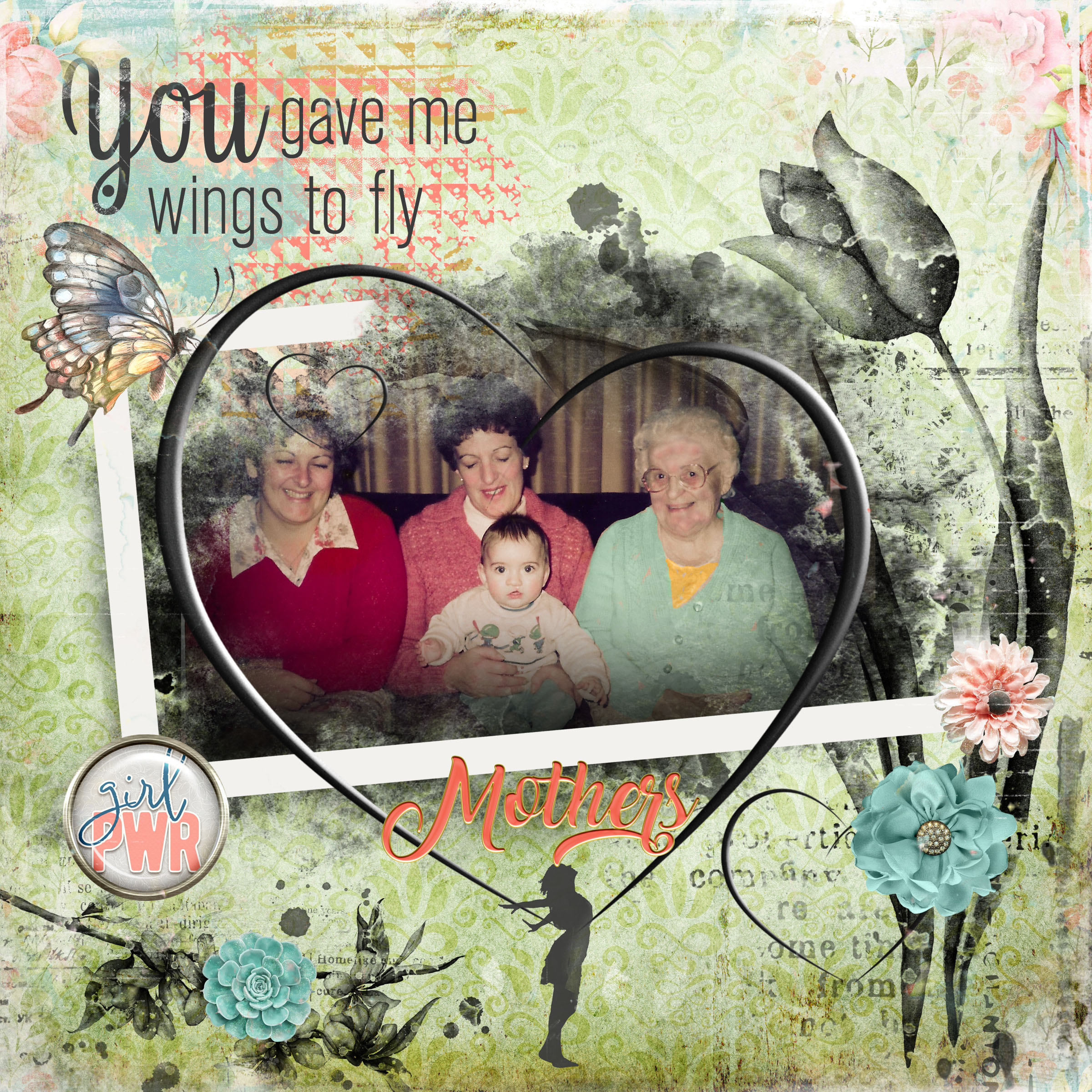 Kit - Celebrating Women. Designer - Karen Schulz. My mother(right) my daughter, Mandy (left) and me in the middle with Dan the first son, grandson and great grandson. Dan has just had his second baby, Sophie. Thank you for viewing and leaving c/v