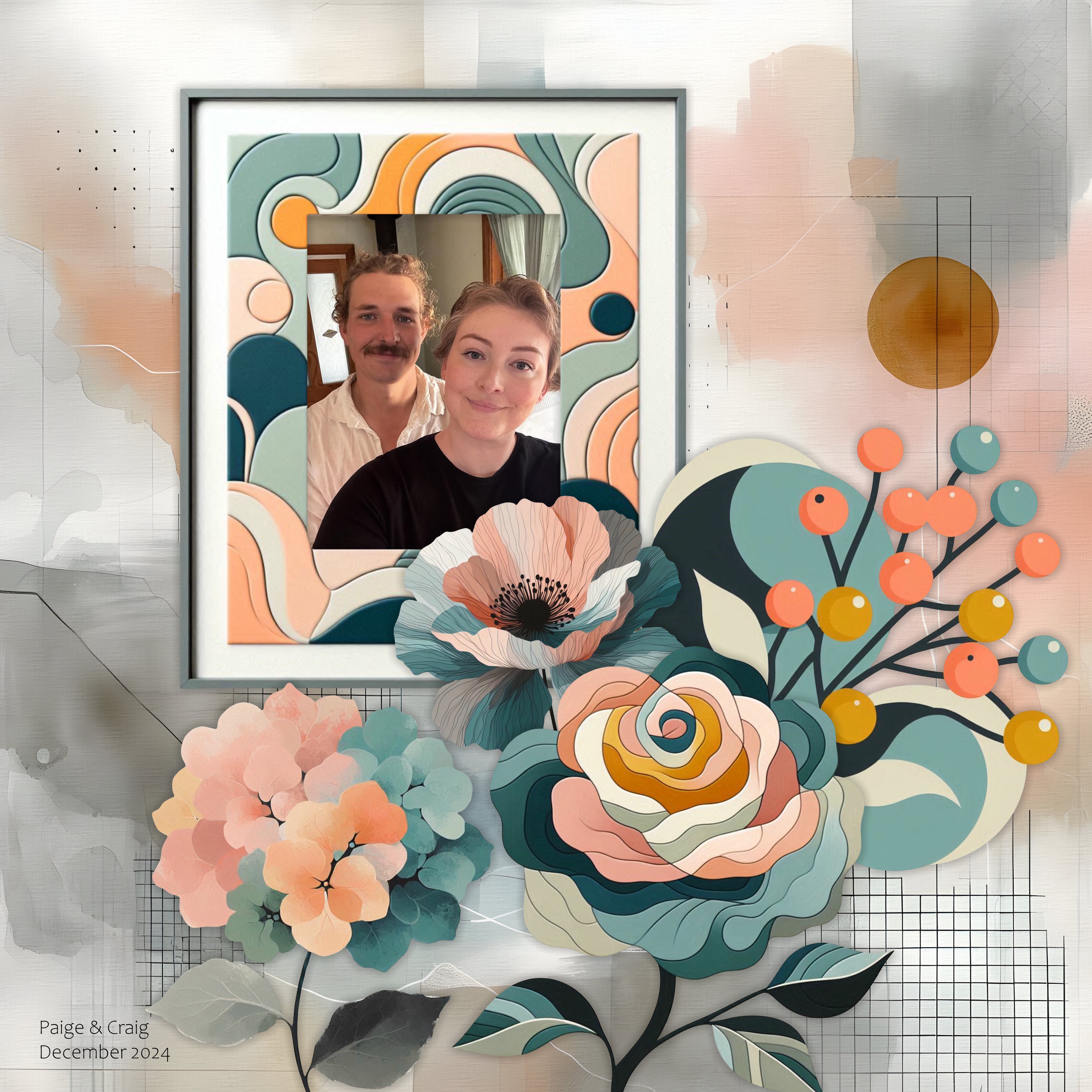 My 2nd page for Joce's Three Times for June 2025 challenge. My Granddaughter Paige and he husband Craig. Playing with abstract
