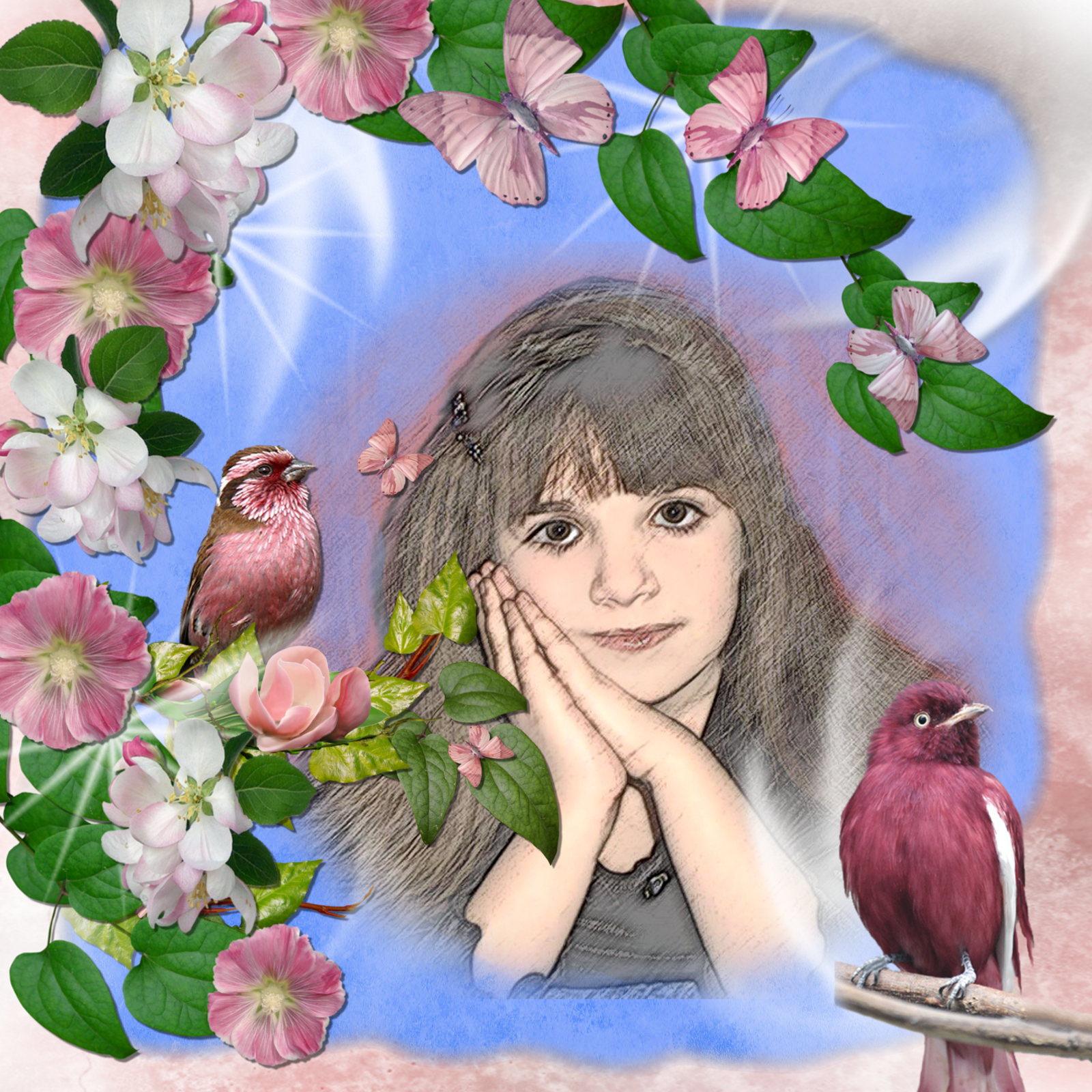 Love the sketch effect margie and your beautiful cluster. The wee birds make a lovely contrast. Gorgeous page.
