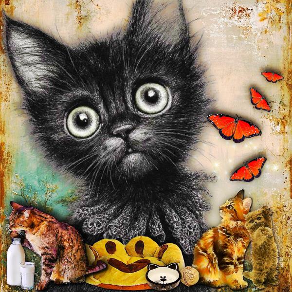 Love the expression on the b & W cat LOL. An amazing page Sherry. Love the kitties especially the one licking the milk bottle. Your butterflies add just the right splash of colour. Thank you so much for joining the challenge. xo
