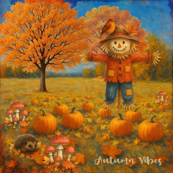 Autumn Vibes for Val's Autumn Bingo 2025 challenge. I chose 2 across: Bird, Scarecrow, Toadstool and Hedgehog