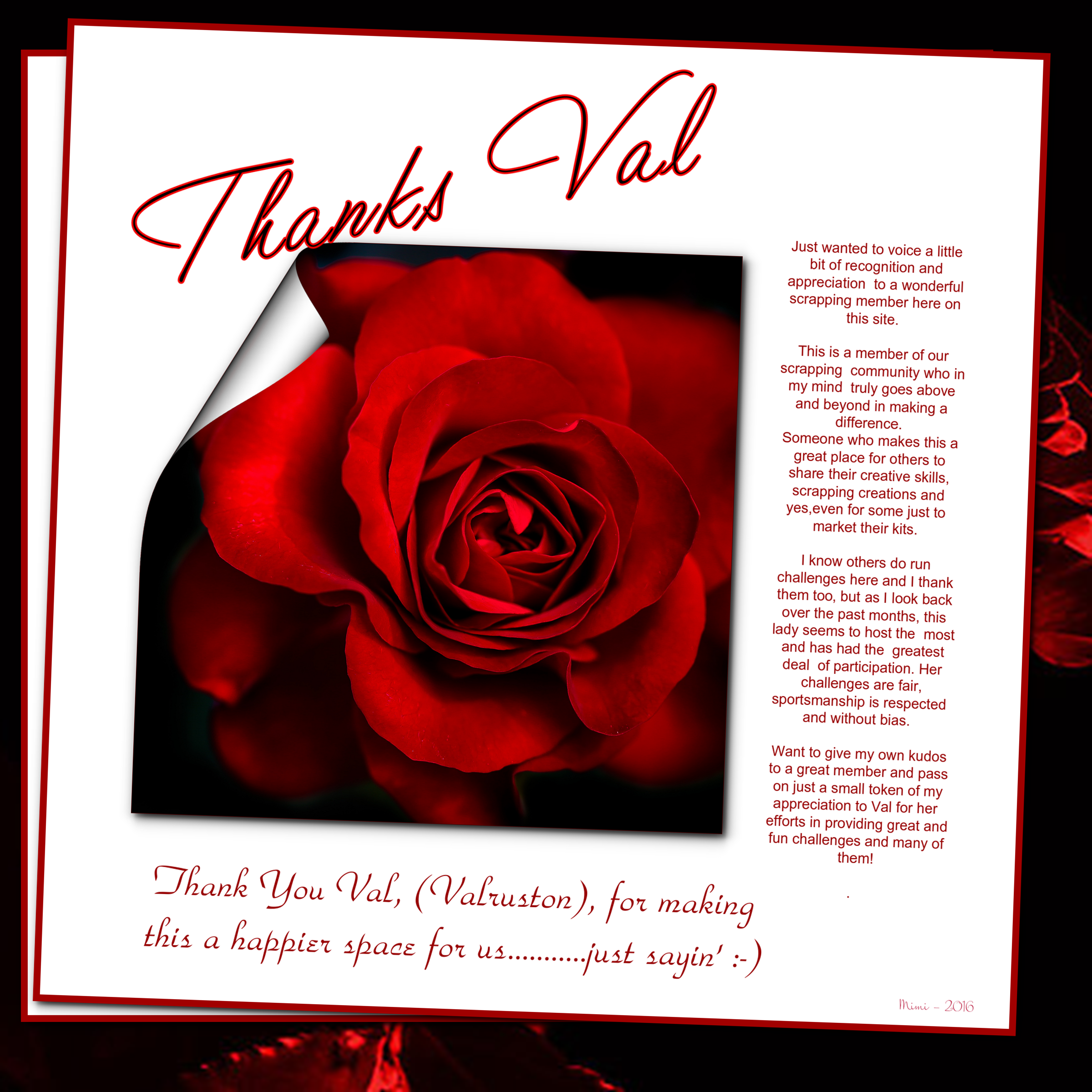 Just a thank you Val for hosting & making this a fun place for many of us. I had several pages made for your challenges but alas I have not been able to participate because of the glitches here.