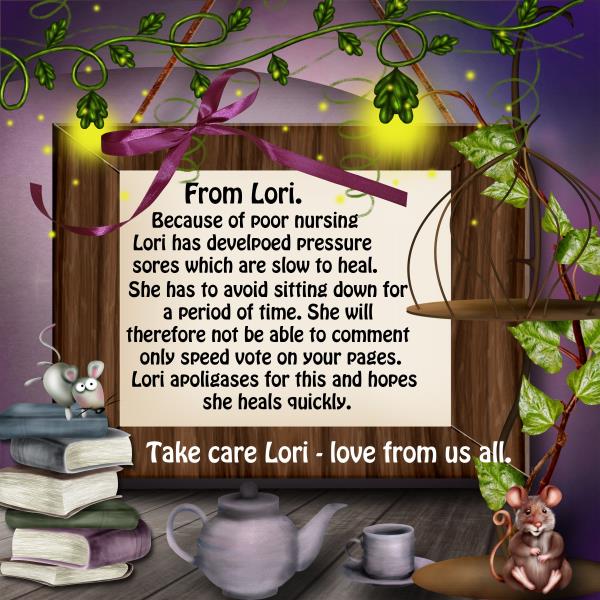Lori has asked me to let you all know about her health problems. She has not had very good nursing since her move and has developed bad pressure sores - the only way for them to heal is if she keeps off them for a long period of time. She will have to lie down only. She has a way of connecting to SBF on a computer above her bed but she will not be able to type just speed vote.