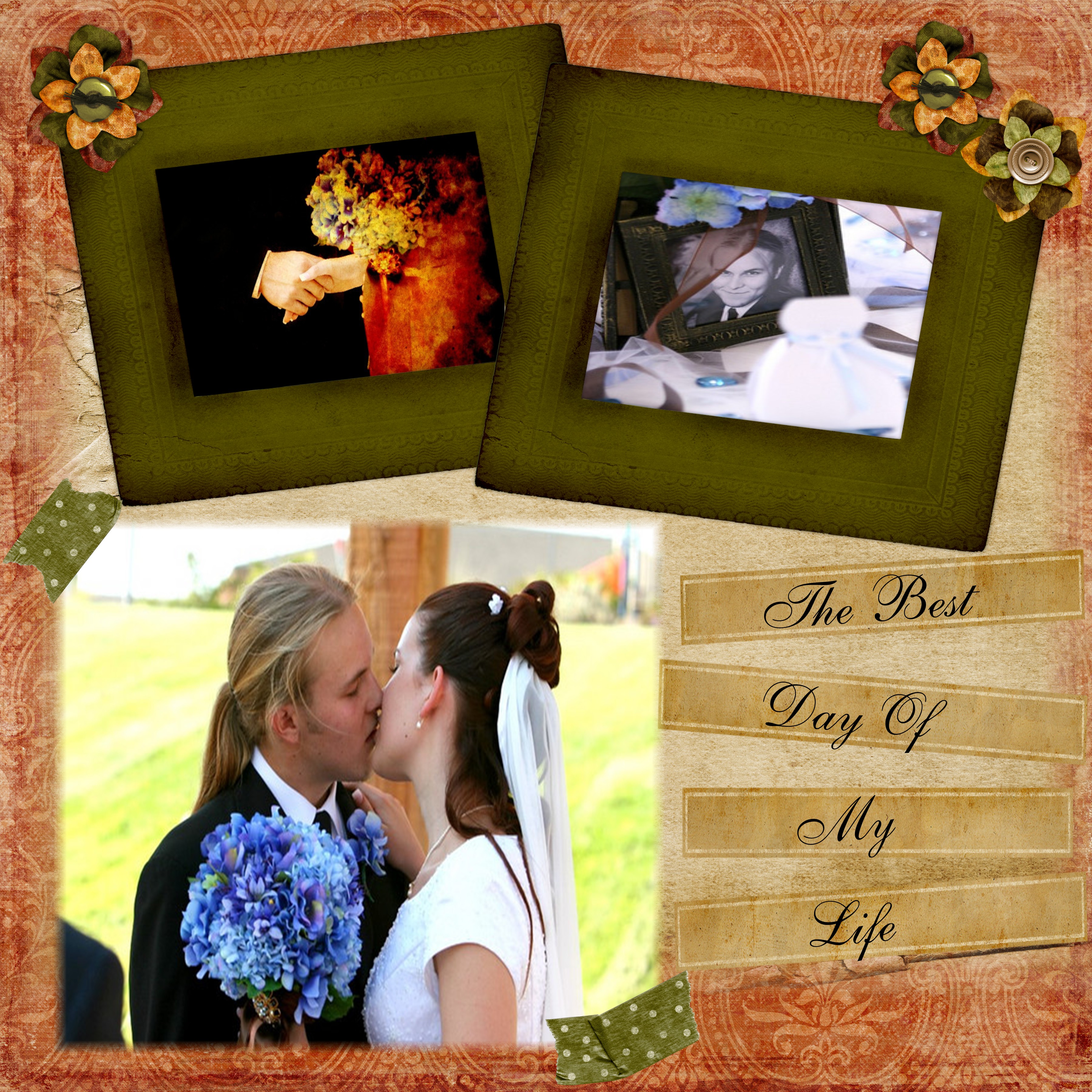 A super page! Such a romantic photo! I love the blue flowers! Stunning contrast with the dress!