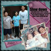 2 photos taken when my son and his 2 cousins were very very small. My son was still wearing his mittens (even tho he was abt 5 months old then) to prevent him from scratching himself till bleeding due to exzema which he still has till today. (In the recent photo, I asked them to stand according to the same position as in the baby photo because I wanted to scrap these 2 photos...lol) How time flies and next year they will be 14 and 13 years old!