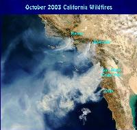 Satellite pic from the October 2003 fires. Next page to come when todays satelite pics are posted. The cedar fire was the largest in San Diego County history. Today's Witch Creek & Harris fires are predicted to break that record. 14000 acres so far to the witch creek fire, 1 death, 20+ injuries and counting.