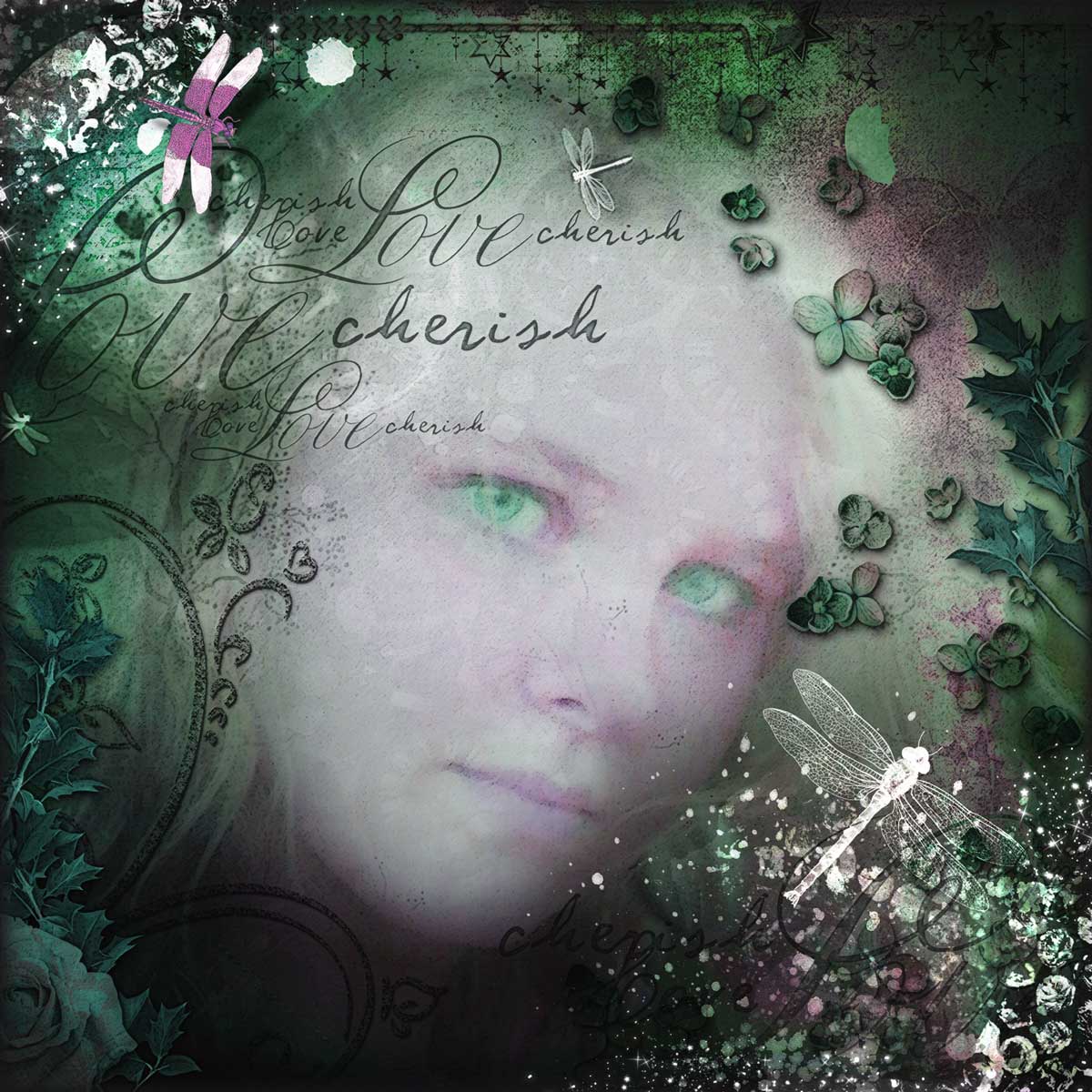 Changed the Hue/Saturation; added a photocopy filter set to Linear Burn blend for a sharper, more detailed feel; paint stamp and dragonfly elements from Janet Kemp in the corners; and a bit of a scatter sparkle brush.