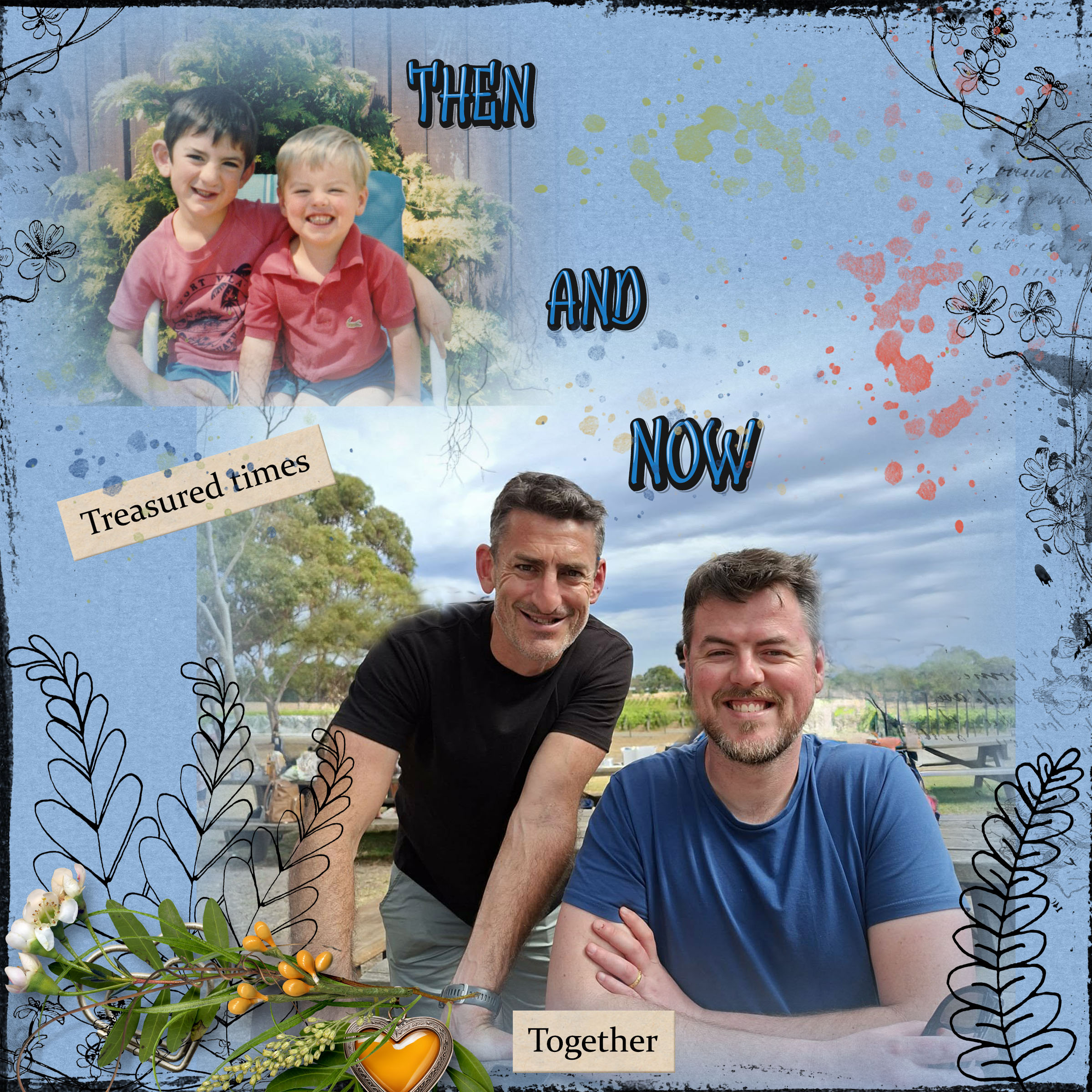 Two of my grandsons (brothers) Dan left and Adam. Dan lives in Melbourne and Adam in Ireland so this was a brief reunion. Dan is dad to George and Sophie. Adam was on his way here to NZ - it was fab to have him and his wife here. I'm making this an icon for a challenge - Then & Now.