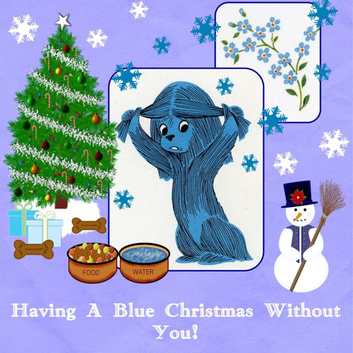 Created with Scrapbook Flair software. Picture of the dog and the forget me knots was cropped from an old card we had from the 1960's.