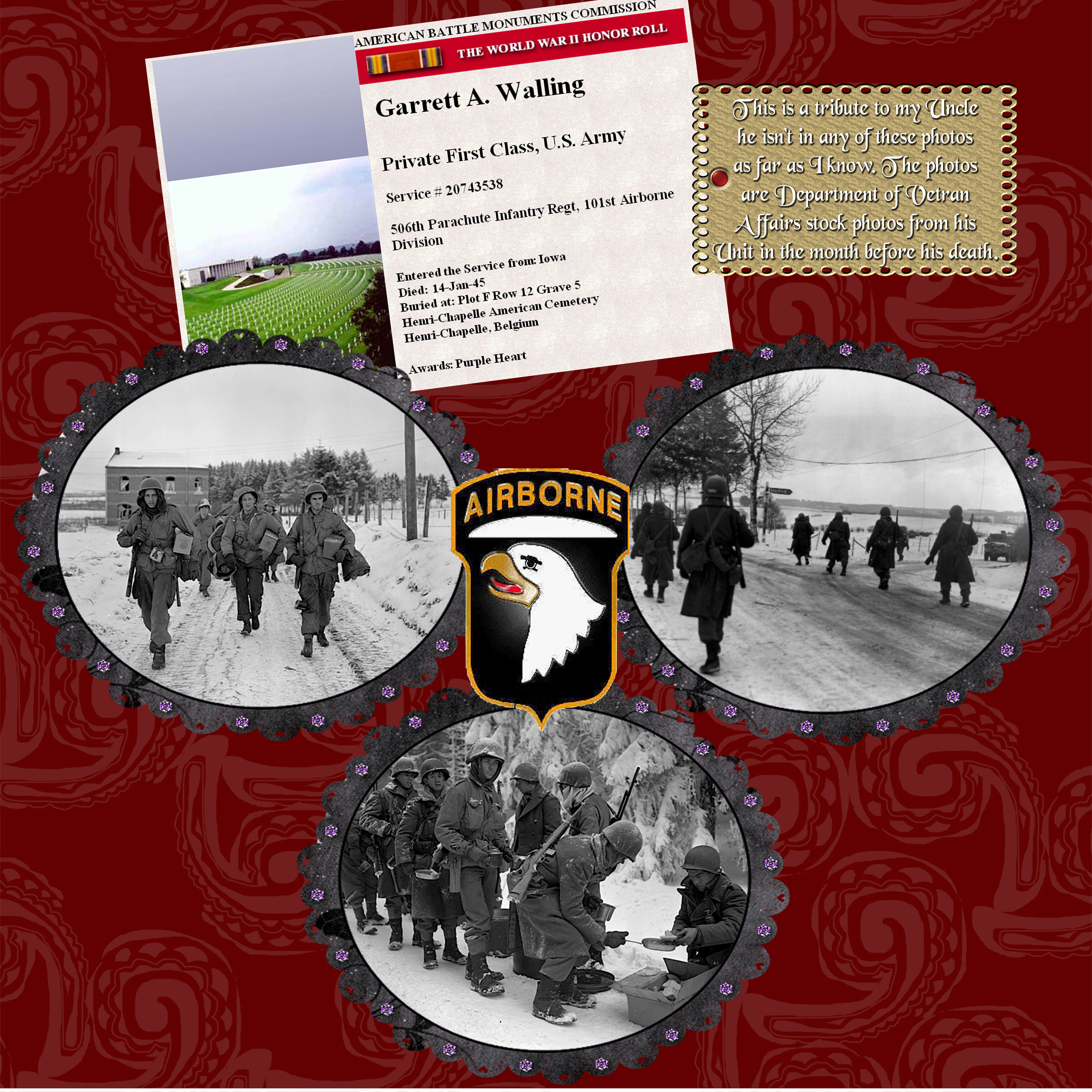 I don't have any pictures of my Uncle. He died in WWII. These are Dept. of Defense stock photos of his unit taken in the days just prior to his death. He was awarded the purple heart, and is buried in the military cometary in Henri-Chapelle, Belgium. Blessed Be, Dark Moon Lilly