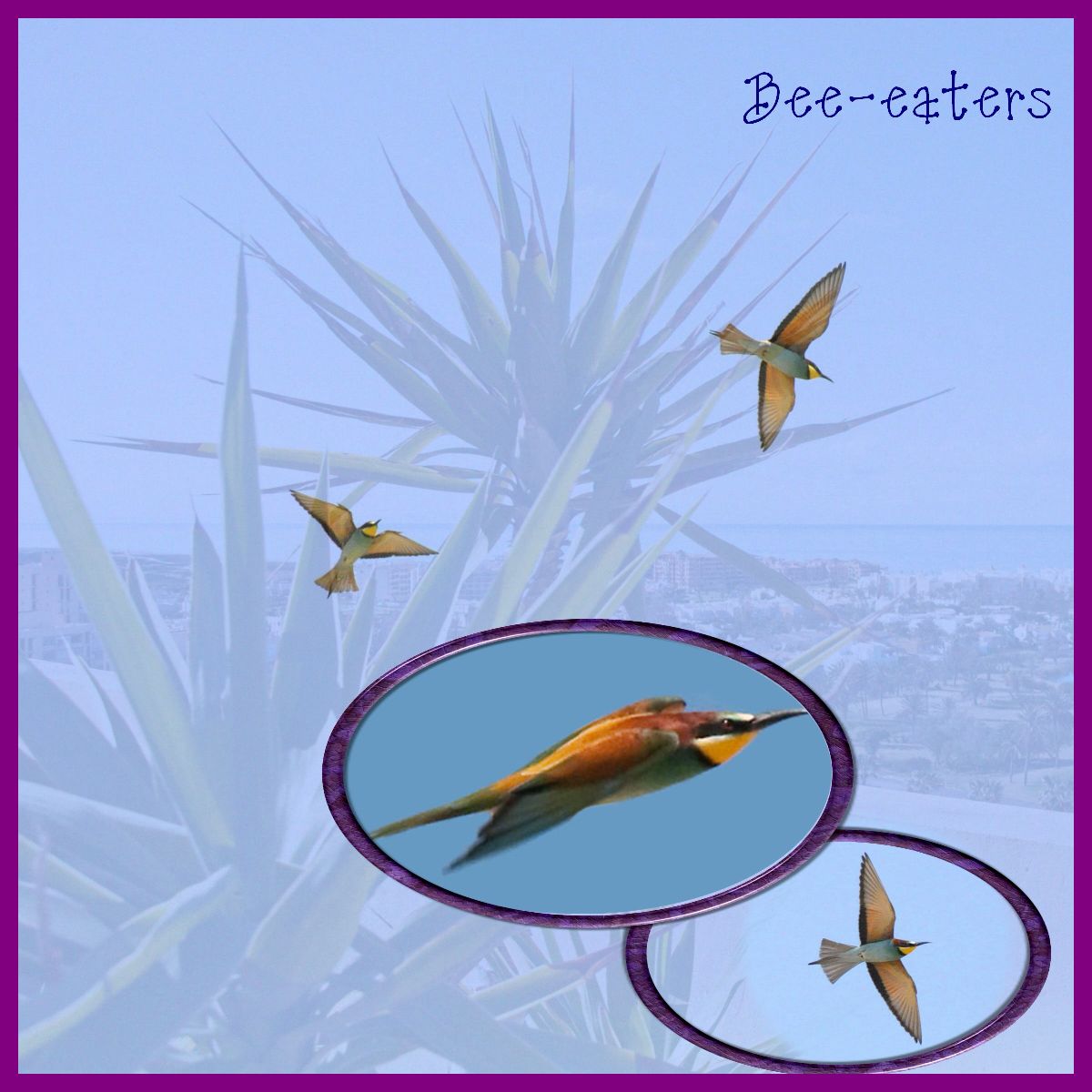 The Bee-eaters arrive here late March early April and fly overhead when we are on the roof garden,as you can see they are a stunning bird. The overlay of these photo's is a photo taken from our roof garden. the 4 photo's that make up this page were all taken by Eddie or myself with a Nikon D90.