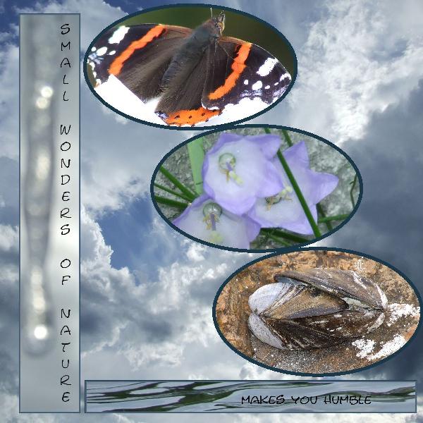I love to take pictures of nature, and I find that nature appears even more magnificent in some pictures than in real life. This is some of my closeup photos. I really love the caressing blueshells. I found them like that at the beach. The font is Scribble.