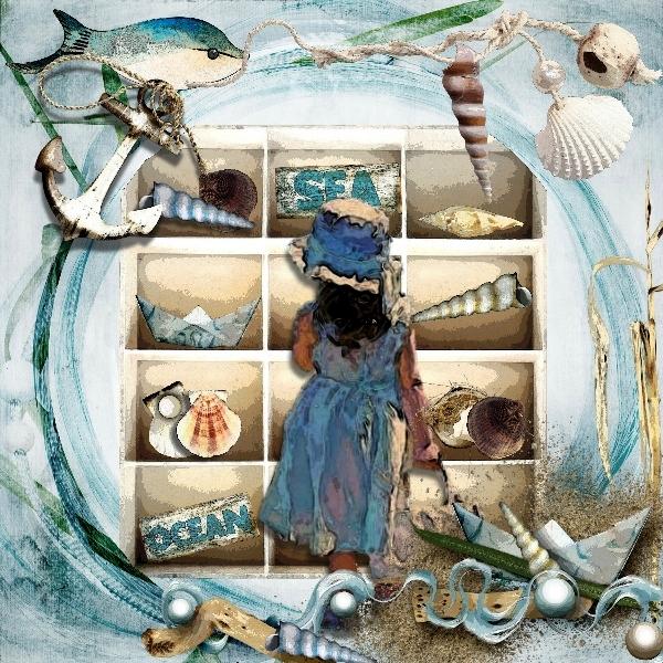 Oh wow this is a stunning creative page. Love the sea shells on the shelving & all the other beach elements. Love your wee lass & the painting effects. Totally magical Love it