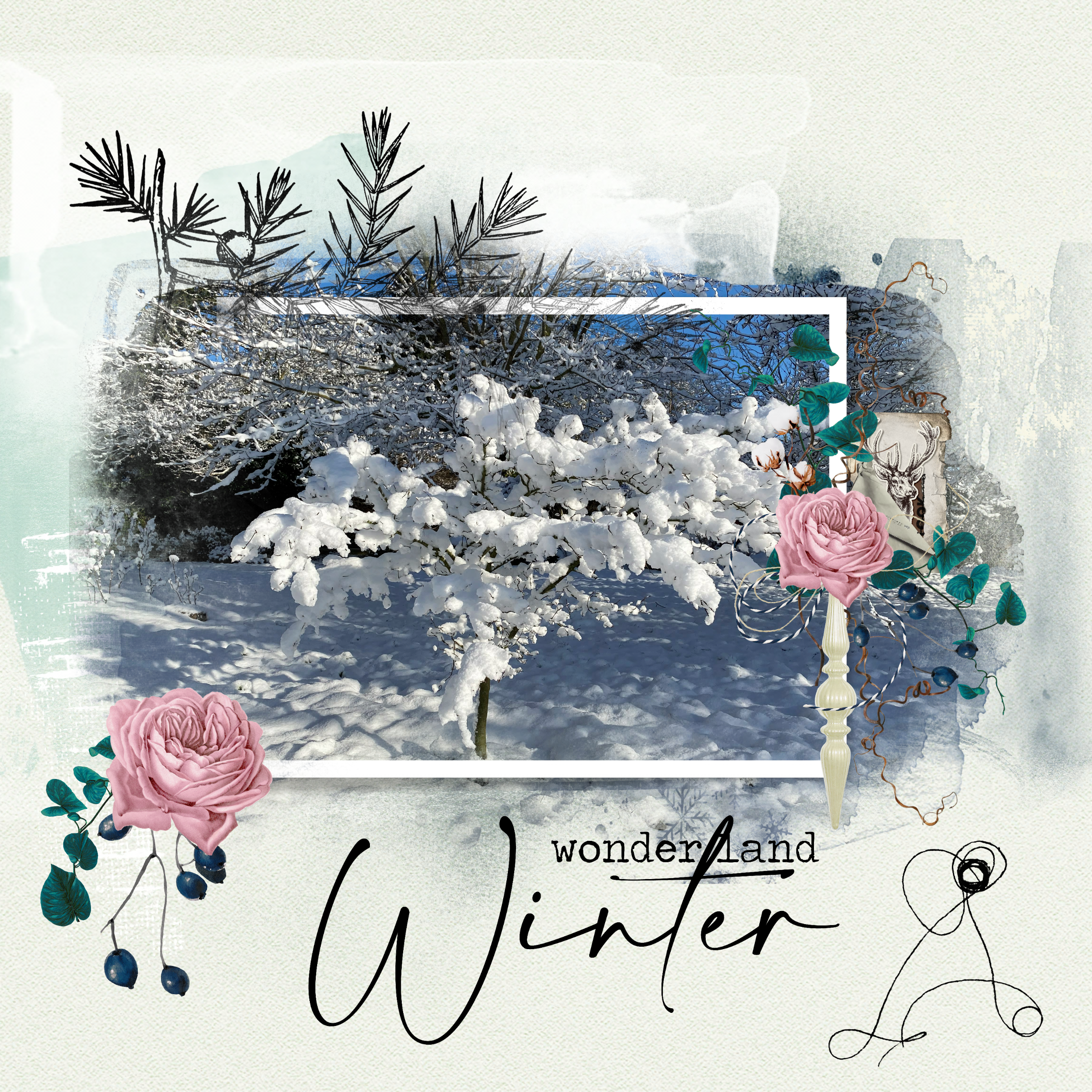 Winter can be really wicked (freezing cold, dirty snow after it stopped and the cars ran it over, having to shovel, etc.) but can also be so very beautiful like you have shown here with that gorgeous snow covering that branch!!! This is a most precious gift of snow embellished beautifully with your page!