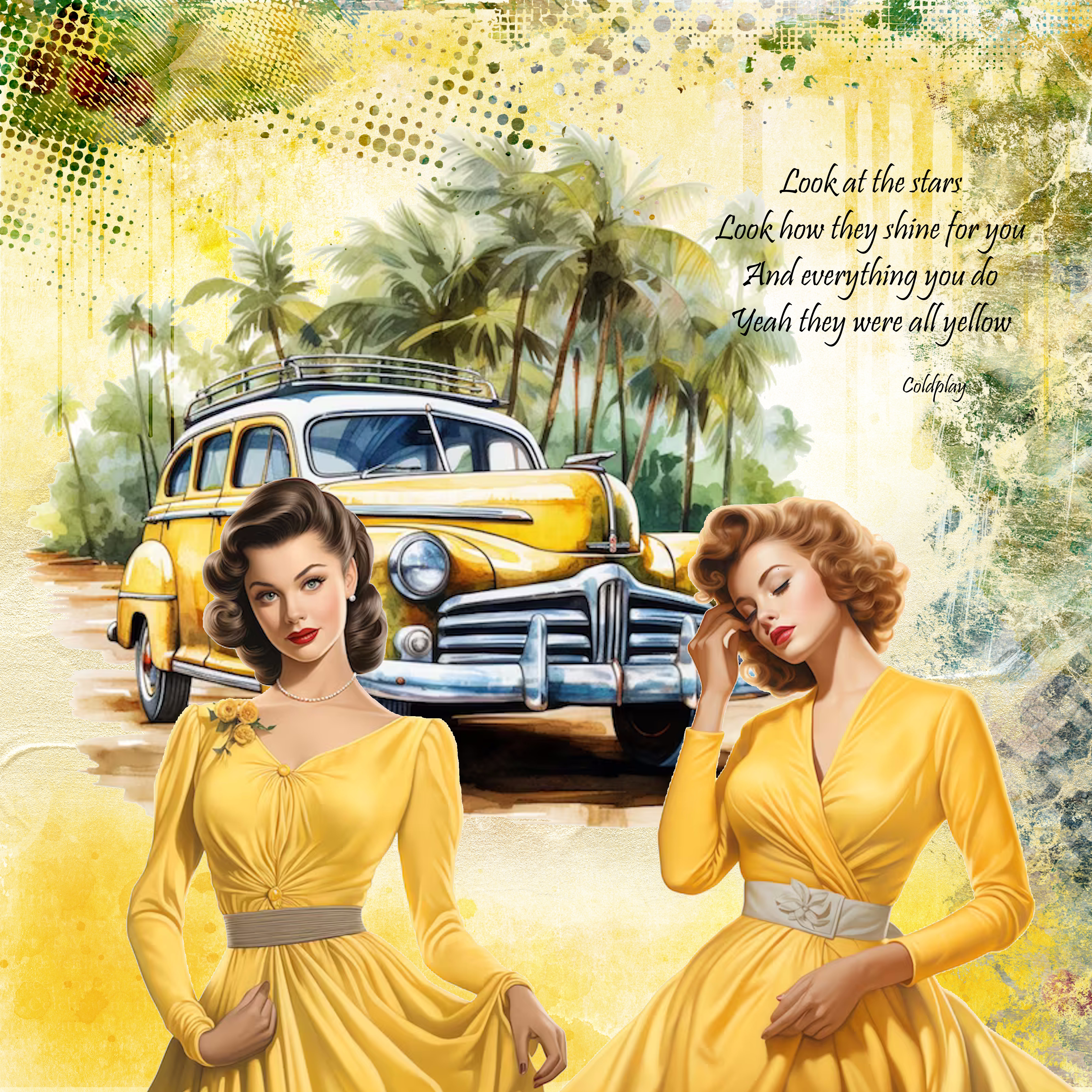 Sunshiney Day by Zesty Designs Shower Flowers by Jen Maddock ArtPlay Palette Shine by Anna Aspnes Designs Intuitive drips by NBK Designs Painted Borders bt Timo Designs 1950's retro girls and AI Yellow car from the net