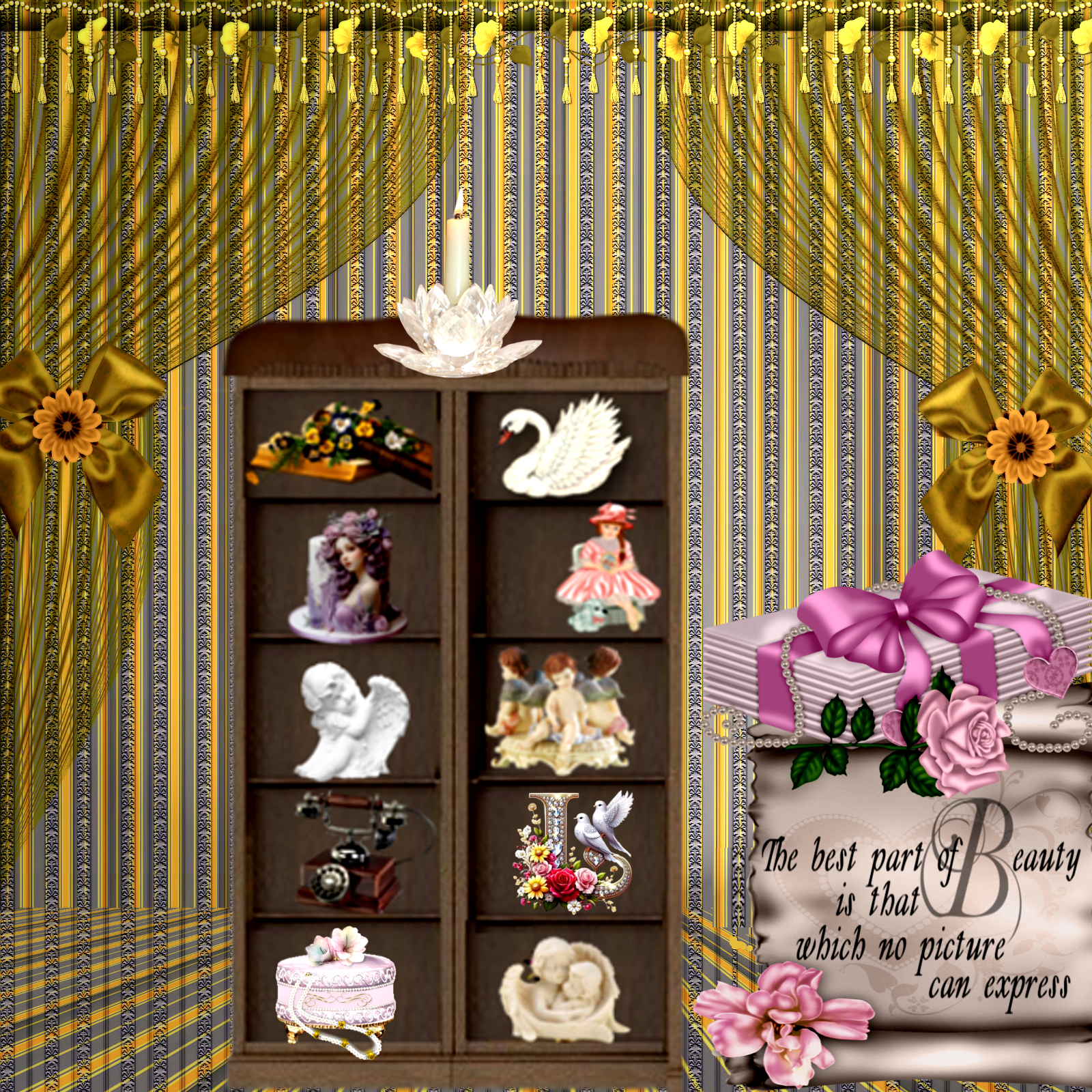 Love your gold background and curtains Margie. They set your cabinet of treasures off perfectly. Wonderful variety in you collection and I like the contrast of the pink with the quote. Thank you so much for creating this beautiful page for the challenge.