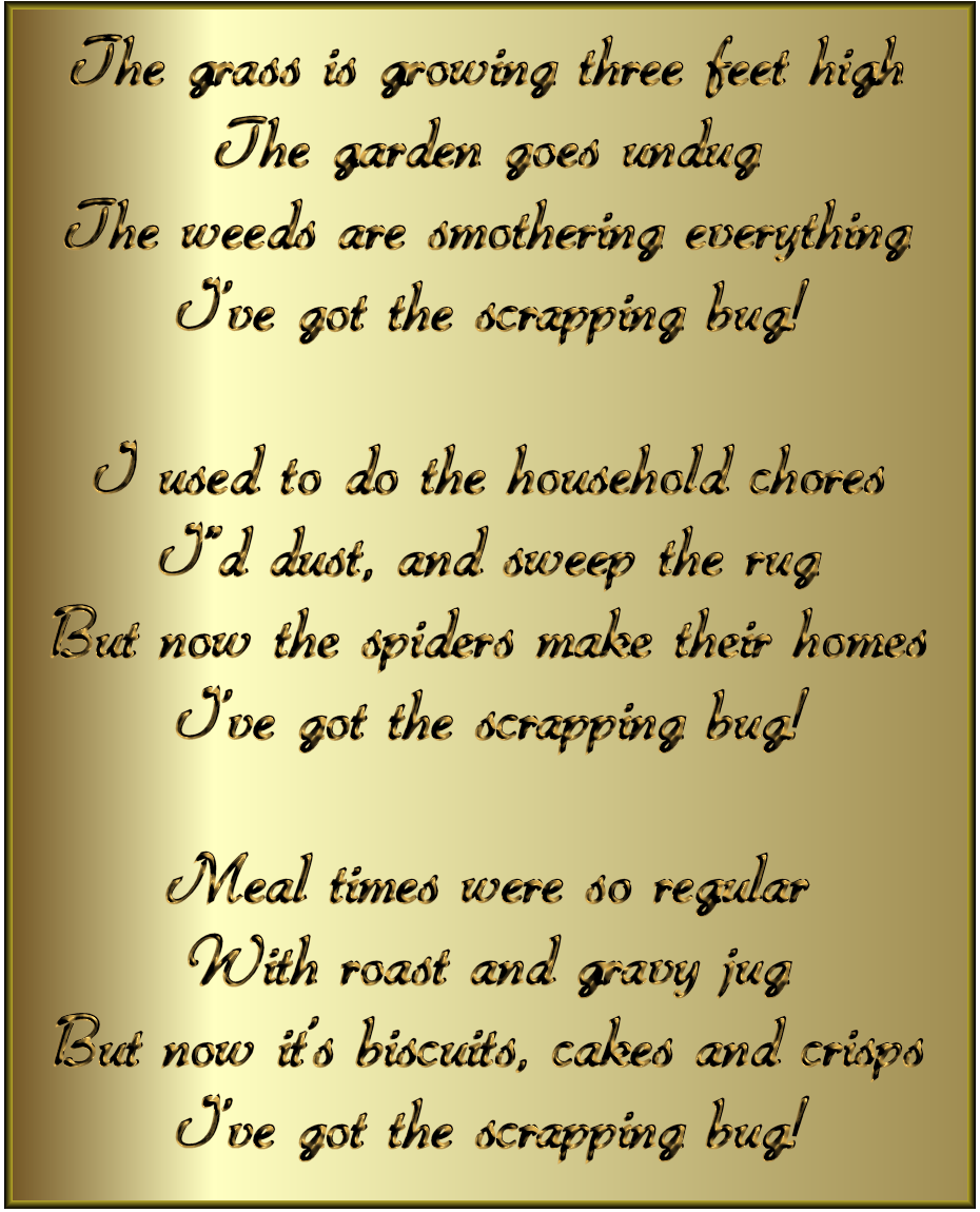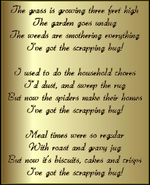On someone's profile was the comment that since they had started scrapping, the household chores were not getting done. I thought I would write a litte 'Ode To Scrappers'